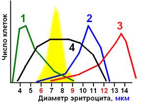 1 – микроцитоз, 2- макроцитоз, 3 –мегалоцитоз при пернициозной анемии, 4 – анизоцитоз на фоне (жёлтом) нормальной кривой Прайс-Джонса.