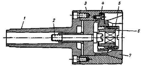 Рис. 16 На рис. 32 показан цанговый патрон. Он удобен тем, что устанавливается на шпинделе с помощью конусного хвостовика 1 и присоединяется к тяге пневматического цилиндра стержнем 2. Точно такое же присоединение имеют и разжимные токарные оправки, что облегчает переналадкустанка. Корпус патрона 3 расточен под сменную цангу 7 и имеет опорные площадки для крестовины 4 регулируемого упора. Упор состоит из крестовины 4, имеющей три лапки (по числу прорезей в цанге), резьбовой втулки 5 и конусной пробки 6. Упор настраивается на требуемый размер ввертыванием втулки 5, положение которой стопорится путем завинчивания конусной пробки 6. В отдельных случаях вместо регулируемого упора могут быть применены специальные упоры, поддерживающие конец детали и дающие ей направление. Сменные цанги выполняются с посадочным отверстием под размер обрабатываемой заготовки, а для деталей с небольшими размерами цанги имеют сменные вкладыши.