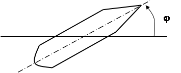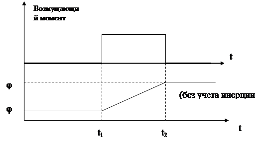 Движение корабля. Рис.4. Величина φ определяет курс корабля (см. рис.4). Предположим что возникает возмущающий момент, изменяющий курс корабля, при этом руль (регулирующий орган) своего положения не изменяет. Из-за возмущающего момента курс начинает изменятся. После устранения возмущения курс перестает изменяться, но к прежнему значению он не возвращается, новое его значение зависит от времени действия возмущающегося момента (см. рис. 5)