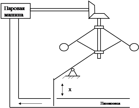 поддерживающий постоянство уровня воды в котле паровой машины. Принципиальная схема регулирования показана на рис.6. Рис.6. Регулируемой величиной является уровень воды в топке H. Причиной, вызывающей отклонения уровня от требуемого значения, является изменение величины отбора пара. В 1784 Д. Уатт изобрел автоматический регулятор скорости вращения вала паровой машины (см.рис.7).