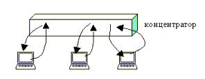 Этот стандарт, иногда называемый Fast Ethernet, является расширением существующей сетевой архитектуры Ethernet и соответствует протоколу физического уровня IEEE 802.30. Его особенностью является то, что он сохранил стандартный для Ethernet метод доступа CSMA/CD, от которого отходили разработчики других технологий повышенной скорости передачи в сети. Сохранение метода доступа означает, что имеющиеся в наличие драйверы для Ethernet будут работать без изменений. Преимуществом этой технологии, появившейся в конце 1993 года, является то, что степень ее совместимости с Ethernet-сетями, позволяет интегрировать ее в эти сети с помощью двухскоростных сетевых адаптеров или мостов. Данная сетевая архитектура использует физическую топологию "звезда" или "звезда - шина" (подобно 10BaseT), где все кабели подключаются к концентратору (рис. 7.7). Различают три спецификации среды: -100BaseT4 (UTR категории 3, 4 или 5 с 4-мя парами); -100BaseTX (UTR или STP категории 5 с 2-мя парами); -100BaseFX (двужильный оптоволоконный кабель). Для реализации этой технологии необходимо две пары проводов или двужильный оптокабель, чтобы организовать дуплексную передачу сигналов по традиционной CSMA/CD, используя одну пару для передачи, а другую - для приема.