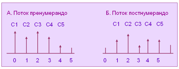 где cn— доход, планируемый к получению в конце n -го года; P — текущая (или приведенная) стоимость, т.е. оценка величины cn с точки зрения текущего момента; r — ставка дисконтирования. Здесь ставка дисконтирования численно равна процентной ставке, устанавливаемой инвестором, т. е. той доходности (рентабельности), которую инвестор хочет и/или может получить на инвестируемый им капитал. Множитель Для принятия решений о целесообразности финансовых или капитальных вложений, об использовании тех или иных финансовых активов необходимо в целом оценить денежный поток (притоки и оттоки, распределенные во времени), генерируемый рассматриваемым вариантом деятельности Элементы денежного потока могут быть либо независимыми, либо связанными между собой определенными функциональными зависимостями. При проведении финансового анализа временные периоды чаще всего предполагаются равными. Для упрощения расчетов предполагается, что генерируемые в рамках одного временного периода поступления или расходы не распределены внутри периода, а сконцентрированы либо в его начале, либо в его конце. В первом случае денежный поток называется потоком пренумерандо, или авансовым, во втором — потоком постнумерандо (рис. 1).