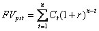 Рис. 1 – Графическое представление потоков пренумерандо и постнумерандо В практических расчетах при оценке доходов чаще всего используется представление денежных потоков, как потоков постнумерандо. Потоки расходов может быть целесообразным рассматривать как потоки пренумерандо. При анализе различных схем накопления денежных средств для последующего их инвестирования также может использоваться поток пренумерандо. Поскольку отдельные элементы денежного потока генерируются в различные временные интервалы, а деньги имеют временную ценность, непосредственное их суммирование невозможно. Оценить денежный поток – значит определить его будущую (прямая задача) или настоящую (обратная задача) стоимость. Будущая стоимость – это стоимость денежного потока, оцениваемого на конец рассматриваемого периода. Настоящая стоимость – это стоимость денежного потока, оцениваемого на начало рассматриваемого периода. Исходя из того, что реальный денежный поток можно рассматривать как пренумерандо, так и постнумерандо, следует, что с каждым денежным потоком связывается по крайней мере четыре оценки: 1. FVpst– будущая (наращенная) стоимость постнумерандо; 2. FVpre– будущая (наращенная) стоимость пренумерандо; 3. PVpst– настоящая (дисконтированная, приведенная) стоимость постнумерандо; 4. PVpre – настоящая (дисконтированная, приведенная) стоимость пренумерандо. В основе суммарной оценки наращенного денежного потока лежит формула (2.6). Очевидно, что будущая стоимость денежного потока постнумерандо FVpst представляет собой сумму отдельных наращенных поступлений, т.е. в общем виде формула такова:
