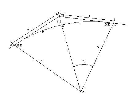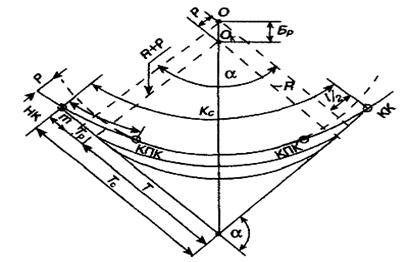 Основные геометрические элементы закруглений в плане с переходными кривыми (рис.2.3) зависят от радиуса