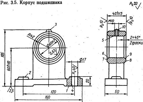 Таким образом, основной тенденцией заготовительного производства является повышение точности и улучшение качества поверхностного слоя заготовок. Однако достижение этих качеств при малой программе выпуска может оказаться экономически невыгодным, так как расходы на оснастку для заготовительных процессов могут превысить экономию на механической обработке. Рассмотрим сказанное на примере детали (рис.3.5), всем обрабатываемым поверхностям которой присвоены номера. Точность и шероховатость пронумерованных поверхностей различны. Поверхности, 2, 3, 4, 6, 7, 8 и 9 нуждаются в однопереходной обработке (строгании, фрезеровании или точении). Поверхность 1, являющаяся базовой поверхностью, требует применения двухпереходной обработки (чистового и чернового фрезерования).