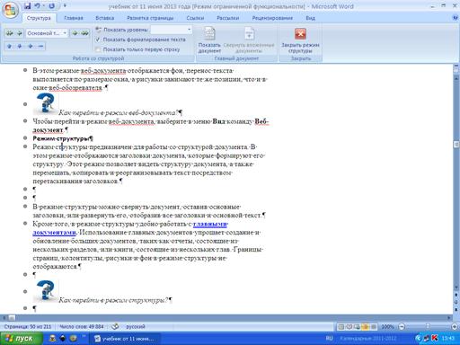 Кроме того, в режиме структуры удобно работать с главными документами. Использование главных документов упрощает создание и обновление больших документов, таких как отчеты, состоящие из нескольких разделов, или книги, состоящие из нескольких глав. Границы страниц, колонтитулы, рисунки и фон в режиме структуры не отображаются.