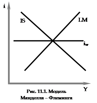 Графическое изображение модели малой открытой экономики приведено на рис. 11.1. Существенных отличий от модели IS – LM несколько. Во-первых, ставка процента является неизменной и равна мировой (горизонтальная линия iw). Во-вторых, положение линии IS зависит от уровня валютного курса (который в модели IS – LM как параметр не фигурирует в явном виде). Повышение валютного курса приводит к сдвигу линии ISвлево (сокращается чистый экспорт) и наоборот. Уровень ставки процента (точнее, возможное отклонение внутренней ставки от мировой) в МОЭ тесно связан с валютным курсом. При заниженном уровне внутренней ставки происходит «бегство капитала»; это означает, что резиденты страны вкладывают свои денежные средства в иностранные активы. Причем в данном случае не имеет значения, какие именно: акции, облигации, краткосрочные государственные ценные бумаги или другие. Главное, с точки зрения нашего анализа, заключается в том, что увеличивается спрос на иностранную валюту. Следовательно, снижается валютный курс, а товары и услуги, производимые в данной стране, становятся дешевле для иностранцев. Поэтому возрастает чистый экспорт, линия IS сдвигается вправо, внутренняя ставка возрастает, и наоборот. Таким образом, внутренняя ставка процента в МОЭ равна мировой, а валютный курс при данном уровне процентной ставки (если отвлечься от эффектов, связанных с денежно-кредитной и бюджетно-налоговой политикой, которые рассматриваются ниже) также имеет единственное равновесное значение. В условиях малой открытой экономики результаты от проведения той или иной денежно-кредитной или бюджетно-налоговой политики могут существенно отличаться от вероятных для закрытой экономики. Причем конкретные последствия и эффективность тех или иных регулирующих мероприятий государства зависит от валютного режима. В действительности реальная экономика, даже достаточно небольшая, ведет себя как система, «промежуточная» между «большой» (описываемой моделью IS–LM) и той, которая соответствует модели Манделла –Флеминга. Резюмируя сказанное, отметим, что денежно-кредитная политика является более гибким инструментом, по сравнению с бюджетно-налоговой. Последнюю гораздо труднее изменять в оперативном режиме. Поэтому макроэкономическое регулирование открытой экономики представляет собой особенно сложную задачу. С одной стороны, для достижения ее равновесия очень важно обеспечить стабильный валютный курс. Но чем более он стабилен, тем меньше возможностей для изменения денежно-кредитной политики (если курс фиксирован, то она, как мы говорили, попросту невозможна). Бюджетно-налоговая политика – более инерционный инструмент. Следовательно, в условиях малой открытой экономики государству необходимо очень тщательно подходить к выбору валюты, к которой планируется «привязать» национальную денежную единицу. Кроме того, часто целесообразно осуществлять не жесткую, а гибкую привязку с тем, чтобы сохранить возможности для денежно-кредитного регулирования экономики, хотя преимущество жесткой фиксации заключается в том, что валютный риск сводится практически до нуля. Выраженные конструктивные черты российской экономики (фиксированный курс и тип «малой» экономики) дают возможность применить классическую модель открытой экономики Манделла–Флеминга(IS - LM -MF). Отсутствие ре