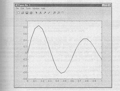 Рис. 2.1. Простейший график функции Для построения графика функции в рабочей среде MatLab должны быть определены два вектора одинаковой размерности, например х и у. Соответствующий массив х содержит значения аргументов, а у — значения функции от этих аргументов. Команда plot соединяет точки с координатами (x(i), у (i)) прямыми линиями, автоматически масштабируя оси для оптимального расположения графика в окне. При построении графиков удобно расположить на экране основное окно MatLab и окно с графиком рядом так, чтобы они не перекрывались, как показано на рис. 2.2.