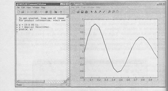 Рис. 2.2. Расположение окон Построенный график функции не должен иметь изломов, т. к. сама функция гладкая. Для точного построения графика вычислите функцию в большем числе точек на отрезке [0, 1], т. е. задайте меньший шаг при вводе вектора х. Не забудьте, что можно занести в командную строку введенные ранее команды при помощи клавиш <↑>, <↓>, затем отредактировать их и выполнить, нажав <Enter>. Следующие команды: » х = [0:0.01:1]; » у = ехр(-х).*sin(10*x); » plot(x, у) приводят к построению графика функции в виде плавной кривой, изображенной на рис. 2.3. Сравнение нескольких функций удобно производить, отобразив их графики на одних осях. Например, постройте на отрезке [-1, - 0.3] графики функций f(x)=sin(1/x^2), g(x)=sin(1.2/x^2) при помощи последовательности команд, приведенной ниже: >>x= [1:0.005:0.3]; >>f =sin(х.^-2); >>sin(1.2*х.^-2); plot(х, f, x, g)