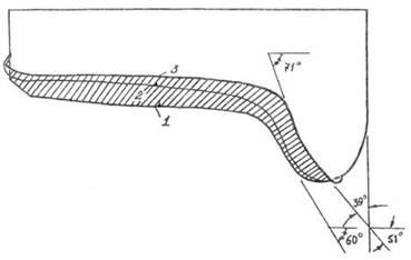 Рис. 2. Профили поверхности катания: 1 – нового колеса; 2, 3 – изношенных колес Какие факторы свидетельствуют о наличии в обращении «шальных» тележек и какие способы можно реализовать для выявления таких тележек? Существует два главных фактора и два способа выявления таких «шальных» тележек. Первый – неодинаковый подрез гребней (износ их у основания) у правого и левого колеса колесных пар. Колесо со значительным подрезом гребня (а у гребня второго колеса подреза нет), при небольшом вертикальном износе бандажа оказывает повышенное боковое воздействие на головку рельса. Самый эффективный способ выявления «шальной» тележки заключается в определении разности толщин гребней в колесной паре. При обнаружении разности толщин гребней у колесной пары более 3 мм делается ее разворот, на вагоне наносится метка РК (разворот колесной пары), и такой вагон должен подвергаться обследованию для выявления причин «шалости» тележки. Второй – непосредственное фиксирование положения вершин гребней колесных пар относительно рельса (при движении поезда) по их отпечаткам на ленте специального прибора, разработанного А.В. Лукьяновым. Устанавливая такие приборы по одной рельсовой нити на разном расстоянии друг от друга, можно выявлять «шальные» тележки. На основании использования таких приборов было составлено (ВНИИЖТ) экспертное заключение, что на каждые 1000 проходящих тележек грузовых поездов, одна-две являются «шальными».
