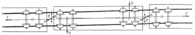 Эксцентриситет е формируется из эксцентриситета закрепления хвостовика автосцепки относительно продольной оси кузова и из эксцентриситета продольной оси кузова относительно продольной оси пути. Последнее объясняется поперечным эксцентриситетом расположения подпятника на надрессорной балке (см. рис. 3) и поперечным эксцентриситетом расположения пятника на хребтовой балке. Если указанные поперечные эксцентриситеты размещения подпятника и пятника в разные стороны составят хотя бы по 0,5 см, а эксцентриситет закрепления хвостовика автосцепки относительно продольной оси кузова 1–1,5 см, то эксцентриситет е может превысить 3 см. Если же на прямом участке эксцентриситет после «выборки» зазоров между гребнями колес и головкой рельса, а также в буксовом, рессорном, пятниковом узлах составит в смежных вагонах, хотя бы по 3 см в разные стороны, то во время ведения поезда в режиме тяги произойдет следующее. При продольной квазистатической (действующей около 2 с) растягивающей силе F (рис. 3), равной 400, 500, 600, 700 кН, групповое боковое воздействие колес тележки определяется по формуле