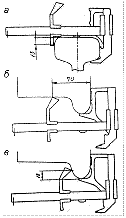 Рис. 5. Положение скобы СК-6 при измерении: а – бокового и вертикального износа головки рельса; б – проката бандажа (обода) колеса; в – износа гребня колеса В настоящее время опытно-конструкторским бюро «Интранс» на заводе «Металлист» в Москве создан двухоперационный прибор скоба СК-6 (рис. 24), предназначенная для замеров проката бандажа и износа гребня колес, вертикального и бокового износа головки рельса. Путейцы-практики должны иметь такой измерительный прибор.