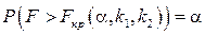 Случайная величина F при условии справедливости нулевой гипотезы имеет распределение Фишера-Снедекора со степенями свободы k 1= n 1-1 и k 2= n 2-1, где n 1 и n 2 – объемы выборок, по которым вычислены большая и меньшая дисперсия соответственно. Критическая область строится в зависимости от конкурирующей гипотезы. 1. Конкурирующая гипотеза Н 1: D (X)> D (Y). В этом случае строят одностороннюю, а именно правостороннюю критическую область, исходя из требования, что вероятность попадания критерия F в эту область в предположении справедливости нулевой гипотезы равна принятому уровню значимости: