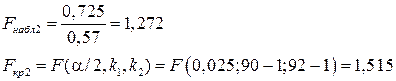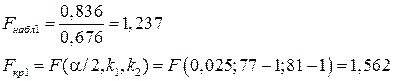 Здесь и далее первый индекс соответствует номеру группы сотрудников, второй – номеру группы нормативов. DХijн – неисправленные выборочные дисперсии, DХij – исправленные выборочные дисперсии. Выдвигаем нулевую гипотезу Н 0: дисперсии средних оценок сдачи нормативов в зимний и летний периоды различаются незначимо. Конкурирующая гипотеза Н 1: дисперсии различаются значимо, D (X 1j)≠ D (X 2j). Для проверки нулевой гипотезы воспользуемся критерием Фишера-Снедекора. Для этого найдем наблюдаемые значения переменной Fнабл и критические точки распределения Фишера-Снедекора Fкр при уровне значимости α=0,05. 1. Для группы №1, которая готовилась к сдаче нормативов по традиционной методике: