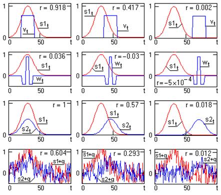 Как видно из таблицы, значения коэффициента корреляции нецентрированных сигналов существенно зависят от положения сигналов относительно нулевой точки пространства. При одностороннем смещении сигналов относительно нуля (шкала Фаренгейта) значение коэффициента корреляции может быть только положительным, и тем ближе к 1, чем дальше от сигналов нулевая точка (шкала Кельвина), т.к. при больших значениях сигналов-векторов значение скалярного произведения сигналов стремится к значению произведения норм сигналов. Для получения значений коэффициентов корреляции, независимых от нуля сигнального пространства и от масштаба единиц измерений, необходимо вычислять коэффициент по центрированным сигналам, при этом в оценках коэффициента, как это видно из результатов, приведенных в таблице, появляется знаковый параметр совпадения или несовпадения по "направлению" корреляции и исчезает зависимость от масштаба представления сигналов. Это позволяет вычислять коэффициенты корреляции различных сигналов вне зависимости от физической природы сигналов и их величины.