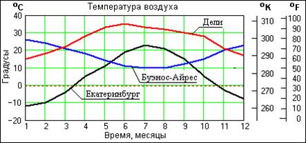 Заметим, что значение косинуса в (2.8) изменяется от 1 до -1, и не зависит от нормы сигналов ("длины" векторов). Максимальное значение cos j = 1 соответствует полной тождественности относительной динамики сигналов, минимальное значение cos j = -1 наблюдается при полной противоположности значений относительной динамики сигналов. По существу, коэффициент Однако количественные значения коэффициентов корреляции существенно зависят от выбора нулевой точки сигнального пространства. Рассмотрим это детально на конкретном примере. На рис. 2.6 приведено изменение средней месячной температуры воздуха в трех городах земного шара в течение одного календарного года. Характер корреляции между изменениями температур в городах достаточно хорошо виден на графиках. Вычислим (см. пример ниже) значения коэффициентов корреляции для шкалы температур по Цельсию.