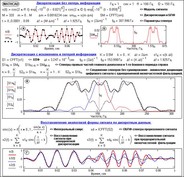 На рис. 7.10 приведено моделирование дискретизации аналогового сигнала, влияние наложение спектров боковых периодов на спектр главного диапазона дискретного сигнала и восстановление из этого спектра аналоговой формы сигнала. Графики А и Б рисунка – модельный аналоговый сигнал, точки его дискретизации и модуль спектра дискретного сигнала. Вычисление спектра выполнено быстрым преобразованием Фурье (БПФ) и отображает, соответственно, частотный диапазон 0-2fN. Дискретизация выполнена корректно, с выполнением условия (7.8), о чем можно судить и по спектру дискретного сигнала (график Б, выход на незначимые значения к частоте Найквиста fN). Кривая S1 на графике В – спектр модельного дискретного сигнала при нарушении условия (7.8). В данном случае это произойдет при увеличении шага дискретизации в 2 раза, что вызовет уменьшение в 2 раза новой частоты Найквиста и перемещение границы главного диапазона на отметку 0.5fN на графике Б, при этом произойдет перекрытие спектров поддиапазонов. На графике приведены кривые S1a и S1b, которые являются раздельными спектрами правой половины главного диапазона без сложения со спектром правого бокового диапазона (интервал 0-2fN, где fN – частота Найквиста новой дискретизации), и левой половины правого бокового диапазона на том же интервале 0-2fN без сложения со спектром главного диапазона. Хорошо видны «хвосты» спектров, выходящие за границы интервала Найквиста от центров диапазонов и заходящие в соседние диапазоны. Сложением этих спектров в интервале 0-2fN нетрудно убедиться, что полученный результат будет полностью соответствовать спектру S1 новой дискретизации исходного сигнала. Обратим внимание, что сложение спектров рядом расположенных диапазонов может вызывать не только увеличение высокочастотных составляющих (как это можно было видеть на рис. 7.4 – спектр S1), ни и их взаимную компенсацию, как имеет место для спектра S1 в данном случае (кривая точками на графике В).