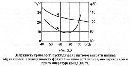 Особливості робочого процесу. Робочий процес дизельних двигунів порівняно з бензиновими відбувається при більш інтенсивних режимах. Так, тиск укінці такту стиску досягає 3...4 МПа, а температура повітря – 500...800 °С. Тиск впорскування палива у тракторних дизелях становить 12 МПа, а в автомобільних – 80... 140 МПа. Час сумішоутворення у дизельних двигунах у 10 разів менший, ніж у бензинових. Так, якщо тривалість випаровування бензину у двигуні дорівнює 0,025 с, то у дизелях (при однаковій частоті обертання вала -0,002...0,003 с. Тому паливо у дизельних двигунах змішується з повітрям значно гірше, що потребує підвищеного надлишку повітря (коефіцієнт надлишку повітря у швидкохідних дизелях становить 1,2... 1,5 проти 0,8...1,1 у бензинових двигунах). Процес сумішоутворення та згоряння палива у дизелі значною мірою залежить від конструкції камери згоряння і характеризується періодом затримки самозаймання – часом від моменту впорскування суміші в циліндр дизеля до її займання. Цей період дуже короткий, але він сильно впливає на подальший процес згоряння палива. Затримка самозаймання суміші, що потрапила до камери згоряння, потрібна для забезпечення її повного випаровування та попереднього окиснення. Випаровування палива нормується за ГОСТ 305–82 його фракційним складом і визначається двома температурами википання палива: t50 та t96. Вплив на цей процес фракційного складу й експлуатаційних властивостей дизельного палива ще не встановлено, хоча в ряді випадків помічено деякі закономірності. Так, використання дизельного палива з більш важким фракційним складом може призвести до підвищення витрат палива, погіршення пуску дизеля (рис.2.3), збільшення нагароутворень, закоксовування кілець, а також до збільшення швидкості зношування деталей двигуна.