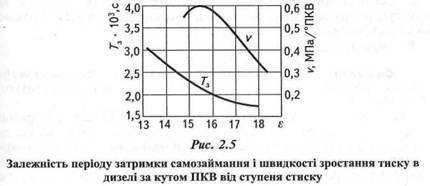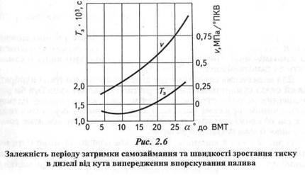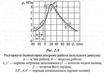 Зовнішні ознаки жорсткої роботи двигуна ідентичні детонаційному згорянню бензину в бензинових двигунах, тобто прослуховується характерний металічний стук від дії ударної хвилі на поршень двигуна. Такт стиску в дизелі супроводжується вібрацією та перегріванням двигуна. Під час жорсткої роботи двигуна спостерігається підвищене зношування корінних підшипників колінчастого вала, особливо вкладишів через ударну хвилю на них; пригоряють, деформуються, а іноді й ламаються поршневі кільця; збільшується прорив газів у картер двигуна; підвищуються витрати палива й олив, а також димність і токсичність відпрацьованих газів. Чим менша затримка самозаймання, тим скоріше займається паливо та повільніше зростає тиск у циліндрі, тобто м'якше працює двигун, і навпаки. Таким чином, жорсткість роботи дизеля, що характеризується швидкістю збільшення тиску залежно від кута ПКВ, пов'язана із затримкою самозаймання палива. При жорсткій роботі двигуна підвищується зношування деталей кривошипно-шатунного механізму, зменшується економічність роботи двигуна та виникають інші шкідливі наслідки. Жорстка робота двигуна спостерігається при зменшенні періоду затримки самозаймання палива (див. рис.2.4). її оцінюють при збільшенні тиску на Г ПКВ. Вважають, що двигун працює м 'яко при збільшенні тиску до 0,25...0,50 МПа на Г ПКВ, жорстко – при 0,6...0,9 МПа і дуже жорстко, коли тиск перевищує 0,9 МПа (такі режими можуть призвести до швидкого виходу його із ладу).