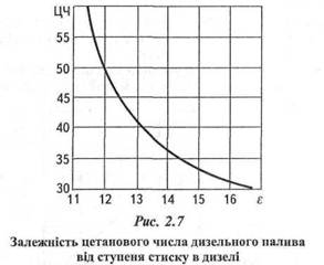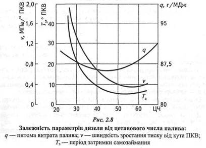 Період затримки самозаймання палива, темп збільшення тиску при його згорянні та, як наслідок, можливість появи жорсткої роботи дизеля залежать від ступеня стиску (рис. 2.5), випередження впорскування (рис. 2.6) та інших чинників, у тому числі випаровування і самозаймання дизельного палива. Підбираючи для кожної конкретної моделі дизеля паливо, що має відповідні властивості (передусім – це в'язкість, температура випаровування та самозаймання), можна забезпечити м'яку роботу, легкий пуск й оптимальні умови проходження робочого процесу в камері згоряння.