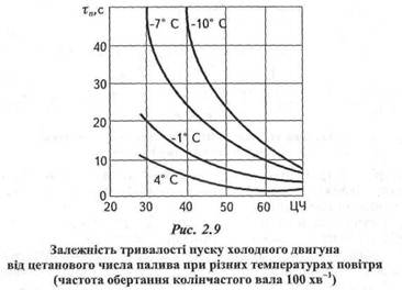 Збільшуючи ступінь стиску, досягають зменшення часу затримки самозаймання палива, зниження швидкості зростання тиску, повільної та м'якої роботи дизеля, зниження питомої витрати палива і поліпшення пускових якостей. Проте процес залежить не тільки від конструктивних особливостей дизельного двигуна, а й від властивостей самого палива. Розглянемо це докладніше. Схильність дизельного палива до самозаймання. Цю властивість дизельного палива та виникнення жорсткої роботи двигуна оцінюють за цетановим числом. Цетанове число – це показник, що характеризує період затримки займання дизельного палива. При визначенні цього числа, як і октанового числа бензину, користуються порівнянням випробуваного дизельного палива з еталонним. Останнє складається з чистих вуглеводнів: цетану (С16Н34) та альфаметилнафталіну (С10Н7СН3). Цетан – це чистий вуглеводень парафінового ряду, для якого характерними є найшвидший розпад й окиснення у стисненому повітрі під впливом температури і тиску. Він має найменший період затримки самозаймання, що забезпечує м'яку роботу двигуна. Альфаметилнафталін – це також вуглеводень, але ароматичного ряду, характеризується найбільшим періодом затримки та високою температурою самозаймання. Звідси різке збільшення тиску на 1° ПКВ і жорстка робота двигуна. Схильність цетану до самозаймання умовно оцінюється у 100 одиниць, а альфаметилнафталіну – в нуль одиниць. При змішуванні цетану з альфаметилнафталіном у різних співвідношеннях одержують низку еталонного палива з різною схильністю до самозаймання. Чим більше цетану в суміші, тим вища її схильність до самозаймання. Для визначення самозаймання дизельного палива треба підібрати такий склад суміші цетану й альфаметилнафталіну, який був би рівнозначний за температурою самозаймання досліджуваному паливу. Таким чином, цетанове число палива визначається відсотковим складом (за об'ємом) цетану в еталонному паливі, що має однакове самозаймання із досліджуваним паливом. Із рис. 2.7 та 2.8 випливає, що дизельне паливо повинно мати цетанове число в певних оптимальних межах. При більш високому це-тановому числі час пуску двигуна при заданій температурі зменшується (рис. 2.9). Однак надійний пуск охолодженого двигуна здебільшого залежить від його конструкції та режиму пуску, ніж від цетанового числа палива.