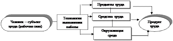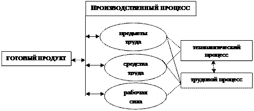 Предметы труда – всё то, что видоизменяется, перерабатывается (земля, её недра, флора и фауна, сырье и материалы, полуфабрикаты и комплектующие изделия). Другими словами, предметы труда - это то, что составляет материальную основу будущего продукта труда. Они могут даваться природой (водные, лесные ресурсы, полезные ископаемые) либо быть результатом переработки в процессе труда (сырье, полуфабрикаты). К предметам труда также относят объекты производственных и непроизводственных работ и услуг, энергетические, материальные и информационные потоки. Средства труда – всё то, что используется, применяется, с помощью чего воздействуют на предметы труда (машины, приборы и оборудование, инструменты, приспособления и другие виды технологической оснастки, средства программного обеспечения, организационная оснастка рабочих мест). По своему составу средства труда неоднородны и подразделяются на такие группы[7]: 1. Орудия труда - органы непосредственного воздействия человека на предмет труда (рабочие машины, оборудование, инструменты). Именно они в наибольшей мере определяют и характеризуют степень овладения людьми силами природы. Развитие орудий труда - показатель технического прогресса. Главный отличительный признак каждой исторической эпохи в развитии производства состоит в степени развития орудий труда. 2. «Сосудистая система производства» - различные емкости для хранения предметов и продуктов труда (чаны, цистерны, трубы, бочки, сосуды, тара и т.п.). 3. Объекты производственной инфраструктуры, обеспечивающие необходимые условия для нормального хода процесса производства (здания, сооружения, дороги, транспортные средства, хранилища, каналы). Земля также является средством труда. В этой роли она выступает, прежде всего, как место, на котором совершается труд, и как естественная сила, поставленная на службу человеку (носительница естественных свойств, используемых в земледелии для выращивания различных культурных растений). К средствам труда относятся и другие естественные силы, используемые в производстве, например, пар, электричество, химические, ядерные реакции и т. п. В современном производстве применение этих сил получает широчайшее развитие. Окружающая среда рассматривается с точки зрения обеспечения безопасности труда, соблюдения требований к условиям труда (санитарно-гигиенические, эргономические, эстетические). Рабочая сила - это совокупность физических и духовных способностей организма и личности человека, используемых им в процессе труда при производстве товаров и услуг. Другими словами, "рабочая сила" – это совокупность физических и духовных качеств, которыми обладает организм, живая личность и которые пускаются человеком в ход всякий раз, когда он производит какие-либо потребительные стоимости. Принято считать, что наличие рабочей силы, т. е. способности к труду как таковой (трудоспособности вообще) является главным условием осуществления любой производственной деятельности. Связи между орудием и предметом труда образуют технологические операции и технологические процессы, а связи работника с орудиями и предметами труда – трудовые операции и трудовые процессы. В совокупности они составляют производственный процесс как процесс производства продукции. Эти взаимосвязи показаны на следующей схеме: