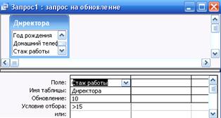 Общие сведения Запрос на обновление позволяет изменить содержимое нескольких строк в одной операции. При создании запроса на обновление необходимо определить следующие объекты. · Обновляемую таблицу. · Столбцы, содержимое которых необходимо обновить. · Значения или выражения, используемые при обновлении отдельных столбцов. · Условия поиска, определяющие обновляемые строки. 1. В окне базы данных в списке Объекты выберите Запросы и нажмите кнопку Создать. 2. В диалоговом окне Новый запрос выберите пункт Конструктор. 3. В диалоговом окне Добавление таблицы добавьте таблицу, которую требуется обновить, и нажмите кнопку Закрыть. 4. В меню Запрос выберите Обновление. Примечание. Если при создании запроса на обновление в области сетки отображается более одной таблицы, конструктор запросов выводит диалоговое окно Обновить таблицу, в котором необходимо выбрать имя одной таблицы. 5. Определите столбцы данных, которые будут обновлены, добавляя их в запрос. Обновляются только столбцы, добавленные в запрос. 6. В столбец Значение в области сетки введите обновленное значение или выражения для столбца. Значение должно совпадать (или быть совместимым) с типом данных обновляемого столбца. 7. Для отбора обновляемых строк введите условия поиска в столбец Условие. Если условие поиска не определено, будут обновлены все строки.