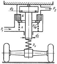 Возрастающее давление жидкости действует на клапан-поршень регулятора с двух сторон головки неодинаково: сверху давление воспринимается большей площадью (сверху диаметр клапана-поршня равен d2, снизу – (d2 - d1)). Под действием разности сил клапан-поршень стремится переместиться вниз. Когда головка клапана-поршня прижмется к уплотнителю полости А и Б будут разобщены. Поэтому дальнейшее возрастание давления в полости А вызовет меньшее возрастание давления в полости Б. Упругая сила РТ торсиона препятствует перемещению клапана-поршня вниз. Сила, воспринимаемая штоком клапана-поршня от торсиона зависит как от массы груза в кузове автомобиля, так и от замедления автомобиля при торможении. При полной загрузке автомобиля и небольших замедлениях расстояние между кузовом и задним мостом небольшое, торсион (пружина) закручен сильно, и сила, препятствующая опусканию клапана-поршня велика. Вследствие этого полости А и Б регулятора разобщается при большом давлении в полости Б, то есть и в колесных цилиндрах задних колес. При порожнем автомобиле и больших замедлениях кузов поднимается над задним мостом; сила, воспринимаемая штоком от торсиона уменьшается и полости А и Б разобщаются при меньшем давлении в полости Б. Таким образом изменяются тормозные силы на задних колесах в зависимости от нагрузки на них и замедления автомобиля. Применение РТС на автомобилях связано с некоторой потерей тормозной эффективности, так как предотвращение блокировки задних колес достигается их недотормаживанием, поэтому дальнейшим развитие средств улучшения тормозной динамики явились антиблокировочные системы (АБС). Назначение АБС – обеспечение оптимальной тормозной эффективности (минимального тормозного пути) при устойчивости и управляемости автомобиля. Для этой цели необходимо независимо от водителя регулировать в процессе торможения подводимый к колесам тормозной момент. Любая АБС включает в себя следующие обязательные элементы: