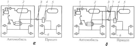 Внешним признаком однопроводной схемы (а) является соединение тормозной системы тягача с тормозной системой прицепа одной магистралью 3, которая одновременно служит и управляющей и питающей линией. При не нажатой тормозной педали 1 через соединительную магистраль 3 происходит подкачка ресиверов 5 прицепа сжатым воздухом. При нажатии на тормозную педаль 1 давление в соединительной магистрали 3 падает (для управления прицепом при такой схеме используется тормозной кран 2 обратного действия) и воздухораспределитель 4 прицепа соединяет ресиверы 5 прицепа с его тормозными камерами 6, вследствие чего прицеп затормаживается. Интенсивность торможения при этом возрастает с уменьшением давления в магистрали 3. Аналогичная ситуация происходит при отрыве прицепа от тягача (в этом случае за счет падения давления в магистрали 3 прицеп будет автоматически затормаживаться). Основным недостатком однопроводной схемы является так называемая «истощаемость» - при неоднократных и частых торможениях, например, на спуске, сжатый воздух из ресивера прицепа расходуется, давление в нем падает, на получая подзарядки из компрессора. В конечном итоге это может привести к невозможности торможения прицепа. По этой причине в настоящее время на подавляющем большинстве автопоездов применяется двухпроводная схема (б). Внешним ее отличием является соединение тормозных систем тягача и прицепа двумя пневмолиниями: питающей 3 и управляющей 7. У двухпроводной схемы подкачка ресиверов 5 прицепа происходит постоянно посредством питающей магистрали 3. При нажатии на тормозную педаль 1 давление в управляющей магистрали 7 увеличивается (для управления прицепом при такой схеме используется тормозной кран 2 прямого действия) и воздухораспределитель 4 прицепа соединяет ресиверы 5 прицепа с его тормозными камерами 6, вследствие чего прицеп затормаживается. Интенсивность торможения при этом возрастает с возрастанием давления в магистрали 7. При отрыве прицепа от тягача также происходит автоматическое торможение прицепа (в этом случае воздухораспределитель 4 среагирует на падение давления в питающей магистрали 3). Двухпроводная схема по сравнению с однопроводной сложнее и дороже (требуется двойной комплект соединительной аппаратуры), менее удобна в обслуживании, недостаточно гибка в регулировании нужной последовательности торможения звеньев автопоезда. Однако благодаря меньшему времени срабатывания (в 1,5 – 2 раза) и постоянному пополнению сжатого воздуха на прицепе двухпроводная схема обеспечивает более надежную и эффективную работу тормозной системы автопоезда. При комбинированной схеме к тягачу могут присоединяться прицепы, оборудованные как для однопроводной, так и для двухпроводной схемы. При этом на тягаче устанавливается три соединительных головки: одна – для соединения с тормозной системой прицепа, оборудованного для однопроводной схемы; другие две – для соединения по двухпроводной схеме. Гидравлическая часть комбинированного тормозного гидропневматического привода является его исполнительной частью, обеспечивает одновременное начало торможения всех колес автомобиля и обладает другими преимуществами, свойственными гидроприводу; пневматическая часть – является командной, обеспечивает легкость управления и позволяет передать тормоз