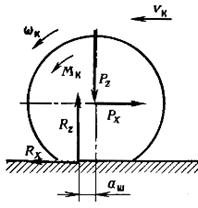 Схема сил и моментов, приложенных к ведущему колесу при его прямолинейном равномерном движении по недеформируемой опорной поверхности (дороге), показана на рисунке.