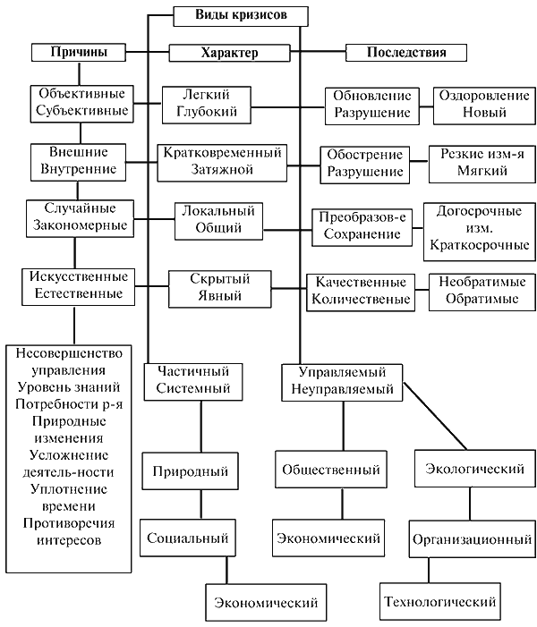 Если есть классификация и знание типа кризиса, есть возможности снижения его воздействия, обеспечения безболезненности его протекания. Согласно классификации, возникают общие и локальные кризисы. Общие кризисы охватывают всю социально-экономическую систему, локальные – одну или несколько подсистем. По проблематике кризиса следует указать макро– и микрокризисы. Макрокризис охватывает всю народнохозяйственную систему. Микрокризис распространяется на отдельную проблему или группу проблем. Но кризис, будучи минимальным, по принципу «домино» может вовлечь в противоречия всю систему или весь процесс развития, так как все элементы взаимосвязаны и взаимодействуют в системе, проблемы решаются комплексно. Кризис охватывает все элементы, когда нет управления кризисными ситуациями, нет мер локализации и снижения его остроты, или наоборот, когда осуществляется намеренная мотивация развития кризиса. По структуре отношений в народнохозяйственной системе, по различной проблематике развития установлены следующие виды экономических, психологических, организационных, социальных, технологических кризисов. Экономические кризисы вызваны резкими противоречиями в экономике страны или отдельного хозяйствующего субъекта. К ним относятся кризисы производства и реализации товара, отношений экономических агентов, кризисы неплатежей, конкурентных пре-имуществ, банкротства и пр. Среди экономических кризисов существуют финансовые кризисы в состоянии финансовой системы и финансовых возможностей. Социальные кризисы возникают при развитии противоречий различных социальных групп. Часто социальные кризисы являются продолжением кризисов экономических, но иногда возникают и отдельно. В совокупности социальных кризисов следует указать политический кризис – противоречия в политическом устройстве общества, кризис власти, кризис противоречий в интересах различных социальных групп, классов, в управлении обществом. Организационные кризисы возникают вследствие противоречий в процессах обособления и интеграции, распределения функций, проектирования организационной структуры, как отделение административных единиц. Организационный кризис проявляется обострением противоречий в процессе организации производства и управления, например в виде излишней бюрократизации. Психологические кризисы – это кризисы психологического состояния человека, например стресс, чувство неуверенности, неудовлетворенности работой, страха, правовой защищенности. Технологический кризис – это кризис новых технологических идей в условиях наличия потребности в новых технологиях. По причинам возникновения кризисы разделяются на природные, экологические, общественные. Первые вызваны воздействием человека на окружающую среду, землетрясениями, ураганами, пожарами, климатическими изменениями, наводнениями. В настоящее время стало особенно актуально прогнозирование, а также распознавание кризисов взаимоотношения человека с природой – экологических, возникающих при изменении природных условий, вызванных деятельностью человека; истощении ресурсов, загрязнении окружающей среды, возникновении опасных технологий, пренебрежении требованиями законов природного равновесия. Кризисы также могут быть предсказуемыми (закономерными) и данными (случайны