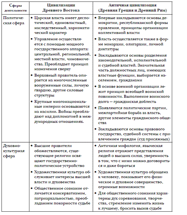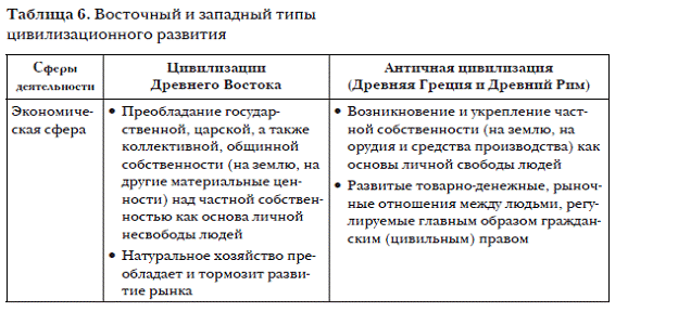. В современной науке на основе изучения древнейших сообществ принято выделять два типа цивилизационного развития: восточный и античный (впоследствии западный), которые представлены в таблице.