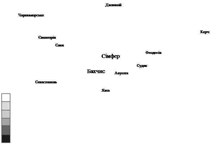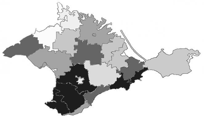 *Джерело: дані Головного управління Держкомстату в АР Крим Щодо регіональної структури площ виноградників в АР Крим, то слід зазначити, що лише в п’яти районах Криму загальна площа виноградників перевищує 2000 га, серед них м. Севастополь, Бахчисарайський, Сімферопольський райони, м. Судак, м. Феодосія, виробництвом винограду продовжують займатися переважно сільськогосподарські підприємства. Що ж до таких регіонів Криму як, м. Сімферополь, м. Євпаторія, м. Керч, Красноперекопській та Роздольненський райони, то площі під виноградниками в них не перевищують 100 га та повністю знаходяться у власності господарств населення (рис. 2).