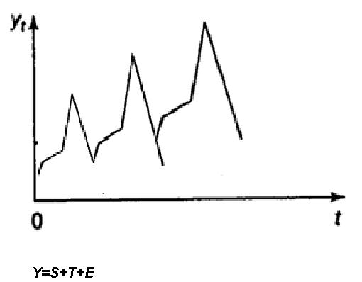• зависимость уровней ряда от времени может принимать различные формы. Во-первых, большинство временных рядов экономических показателей имеют тенденцию, которая характеризует совокупное долговременное воздействие множества факторов на динамику изучаемого показателя. T(возможно а0 + а1 * X )? S – (сезонные компоненты) При изучении временного ряда можно рассмотреть т.н. АДДИТИВНУЮ модель. Задачей анализа при этом будет нахождение составляющих этой модели.