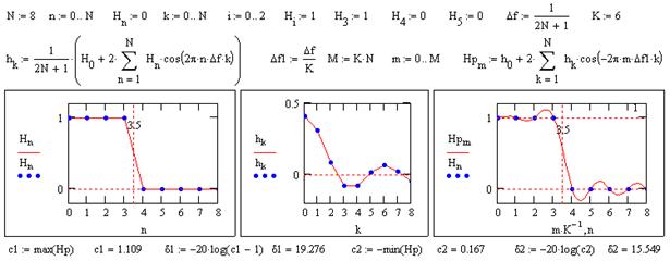 Частотная характеристика оптимального фильтра низких частот приведена на рис. 7.6.1. В полосе пропускания реальная характеристика фильтра осциллирует с постоянными амплитудными колебаниями между значениями 1-dp и 1+dp. В полосе подавления осцилляции постоянной амплитуды находятся в интервале 0-ds. Разность между идеальной и практической характеристиками представляет собой функцию ошибок E(f). Оптимальный метод позволяет определить коэффициенты фильтра h(n), для которых значение максимальной взвешенной ошибки минимизируется min[max(E(f))] в полосе пропускания и в полосе подавления, при этом характеристика фильтра будет иметь равные колебания в пределах полос пропускания и подавления, а количество экстремумов колебаний у фильтров с линейной фазовой характеристикой обычно прямо связано с количеством коэффициентов фильтра (N+1)/2. При расчете фильтра ключевым моментом является определение положения частот экстремумов, которое выполняется итерационным алгоритмом Ремеза, после чего по положениям экстремумов задается частотная характеристика фильтра и определяются его коэффициенты. Методика расчета оптимальных фильтров подробно с примерами, в том числе в среде Matlab, рассмотрена в работе /43/. Метод частотной выборки представляет собой вариант метода расчета фильтра по частотной характеристике без применения весовых функций и может применяться для расчетов как частотно-избирательных фильтров, так и фильтров с произвольной частотной характеристикой. В основе метода лежит непосредственное задание частотной характеристики фильтра в цифровой форме с последующим подбором переходных зон под требуемые характеристики фильтра по величине допустимых осцилляций в полосе пропускания и подавления. Расчет желательно вести в интерактивном режиме, например, в среде Mathcad. В качестве примера приведем расчет низкочастотного фильтра.