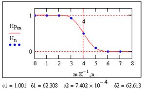 Допустим, нам требуется достаточно простой симметричный низкочастотный фильтр с шириной переходной зоны порядка 0.2 главного частотного диапазона (при Dk=1 для фильтра, fN = 0.5 Гц для спектра и ширина переходной зоны 0.2 х 0.5 = 0.1 Гц). Минимальный размер фильтра при идеальной характеристике для обеспечения такого перехода 2N+1 = 2(1+1/0.1) = 11 точек. С учетом расширения переходной зоны при уменьшении осцилляций на границе зон примем для начала N=8. Частотная характеристика проектируемого фильтра (правая половина) приведена на рис. 7.6.2 с границей раздела зон между 3 и 4 отсчетами спектра. Расчет оператора фильтра проводим обратным преобразованием Фурье, а по полученным отсчетам оператора вычисляем фактическую частотную характеристику этого оператора с уменьшением шага по частоте в 4-6 раз, что позволяет выявить осцилляции и определить погрешность фильтра (по максимумам осцилляций).