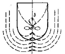 рис.6.6. Сила попутного потока Экспериментально установлено, что в верхней половине диска винта скорость попутного потока больше, чем в нижней. Неравномерность поля скоростей попутного потока в диске винта за один оборот вызывает изменение угла атаки и соответственно сил упора и момента на лопастях, проходящих верхнее и нижнее положения. Так, лопасть, находящаяся в верхнем положении, будет иметь больший угол атаки и соответственно большее сопротивление вращению, чем лопасть, находящаяся в нижнем положении. В результате возникает боковая сила, которая на переднем установившемся ходу (винт правого вращения) будет уклонять корму судна влево. Сила попутного потока b проявляет себя в наибольшей степени на переднем установившемся ходу, вызывая уклонение кормы судна в сторону, обратную вращению винта. Сила реакции. Лопасти гребного винта, проходящие верхнее положение, находятся значительно ближе к поверхности воды, чем лопасти,проходящие нижнее положение. В результате этогопроисходит засасывание воздуха в верхние слои воды, чтозначительно изменяет силовые характеристики лопасти(упор и момент). Влияние близости поверхности воды наиболее существенно проявляется при малом заглублении винта (у транспортныхсудов, следующих в балласте, лопасть в верхнем -положении вообще выходит из воды), в период неустановившегося движения (дача хода со «стопа»), при реверсах. Разность упора и момента на верхней и нижней лопастяx, приводит к образованию боковой силы реакции D. На установившемся ходу и с увеличением заглубления винта действие силы реакции резко уменьшается.