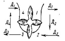 Рис.6.6. Действие силы реакции D. В 1-м секторе лопасть, переходя из положения 1 в положение 2, встречает сопротивление воды, сила реакциикоторой будет направлена вначале справаналево (сила Д1,а затем снизу вверх (сила Д2); последняя на диаметральнуюплоскость судна не влияет, но дает вибрацию кормы. Во 2-м секторе лопасть, переходяиз положения 2 в положение 3, встречает сопротивление воды, сила реакции которой направлена сначала снизу вверх (сила Д2), а затем лопастьбудет преодолевать силу реакции достаточно плотных слоев воды (сила Д3), направленную слева направо и значительно большую, чем сила Д 1. Следовательно, корма судна будет отклоняться вправо, а нос — влево. В 3-м секторе лопасть, переходя из положения 3 в положение 4, встречает сопротивление воды, сила реакции которой будет направлена вначале слева направо (сила Д3), а затем лопасть будет преодолевать силу реакции Д 4, направленную сверху вниз. На диаметральную плоскость судна эта сила не влияет, но дает вибрацию кормы. В 4-м секторе лопасть, переходя из положения 4 в положение 1, встречает сопротивление воды, сила реакции которой направлена вначале сверху вниз (сила Д 4 ), а затем лопасть будет преодолевать силу реакции менее плотных слоев воды (сила Д1), направленную справа налево, значительно меньшую, чем сила Д3. Следовательно, корма судна будет отклоняться вправо, а нос — влево. Сила реакции D проявляется в наибольшей степени в период неустановившегося движения, вызывая уклонение кормы в сторону вращения винта. Сила набрасываемой струи. Гребной винт при вращении закручивает прилегающие к лопастям массы воды и отбрасывает их, образуя мощный спиральный поток. При движении судна вперед этот поток воздействует на расположенный позади винта руль. При движении задним ходом поток воздействует на кормовой подзор судна. Образованный винтом спиральный поток можно представить в осевой (аксиальной) и касательной (тангенциальной) составляющих. Аксиальная составляющая, воздействуя на расположенный за винтом руль, значительно повышает его эффективность и никаких боковых сил не вызывает. При движении судна задним ходом аксиальная составляющая, воздействуя на симметричные обводы кормы, также никаких боковых сил не вызывает. Тангенциальная составляющая на переднем ходу воздействует на перо руля в левой верхней и правой нижней половинах. Из-за несимметричности распределения попутного потока по осадке судна, а следовательно, и вызванных окружных скоростей в потоке, натекающем на руль, воздействие тангенциальной составляющей на правую нижнюю половину руля будет больше, чем на левую верхнюю. В результате возникает боковая сила набрасываемой струи С.
