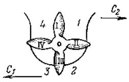 Рис.6.7. Действие силы С В 1-м секторе лопасть, переходя из положения 1 в положение 2, отбрасывает слои воды в сторону от судна, и никакой силы набрасывания струи не образуется. Во 2-м секторе лопасть, переходя из положения 2 в положение 3, набрасывает слои воды на нижнюю поверхность руля, где плотность воды значительно больше.. Руль должен был бы иметь стремление отклониться влево, но поскольку он установлен в диаметральной плоскости судна, сила набрасываемой струи устремляется на всю корму судна и отводит корму судна влево, а следовательно, нос идет вправо. Обозначим эту силу через С 1. В 3-м секторе лопасть, переходя из положения 3 в положение 4, будет отбрасывать слои воды от судна, следовательно, никакой силы набрасывания струи не будет. В 4-м секторе лопасть, переходя из положения 4 в положение 1, набрасывает снова слои воды, но уже с другой стороны, нежели во 2-м секторе, и на верхнюю часть руля. Обозначим эту силу набрасывания струи С 2. Действие этой силы будет меньше, чем действие силы набрасывания струи С 1 во 2-м секторе, вследствие меньшей плотности воды. Отсюда следует вывод: винт правого вращения на установившемся переднем ходу, действуя на руль, отклоняет корму судна влево, а нос — вправо
