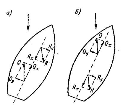 Рис.7.2. Действия силы инерции и силы сопротивления воды при уходе судна с курса. Разложим эти силы на составляющие, направленные вдоль диаметральной плоскости судна и перпендикулярно к ней. Составляющие Qx и Rx, лежащие в диаметральной плоскости, на уклонение судна с курса влияния не окажут (рис. 7.2,а). Составляющие Qv и Ry, действующие перпендикулярно диаметральной плоскости, образуют пару, влияющую на уклонение судна с курса. Плечом этой пары будет расстояние между центром тяжести судна и точкой приложения сопротивления воды В зависимости от взаимного расположения указанных точек пара сил Qy и Ry может или препятствовать или способствовать дальнейшему уклонению судна с курса. Так, в случае расположения точки приложения силы сопротивления воды впереди центра тяжести пара сил будет увеличивать уклонение с курса; в другом случае (рис. 7.2,б), когда точка приложения силы сопротивления воды находится позади центра тяжести судна, составляющие Qy и Ry образуют пару, способствующую возвращению судна на курс; при таком расположении рассматриваемых точек устойчивость на курсе будет сохранена, но путем снижения поворотливости судна. Опытными данными установлено, что лучшая управляемость достигается тогда, когда точка приложения силы сопротивления воды совпадает с центром тяжести судна или находится несколько позади него. В этом случае перекладкой руля достигается как удержание судна на курсе, так и выполнение различных поворотов при маневрировании. Как показывают теоретические исследования и опытные данные, современные морские суда не обладают в полной мере устойчивостью на курсе. Даже при отсутствии ветра и волнения судно периодически отклоняется от курса, и его возвращают к заданному направлению действием руля. Обычно считают судно устойчивым на курсе, если при ветре и волнении не свыше 3 баллов перекладку руля приходится делать не более 4—6 раз в минуту, причем требуется выводить руль из диаметральной плоскости не более чем на 2—3° на каждый борт. Таким образом, частота и угол перекладки руля для удержания судна на курсе служат показателем устойчивости данного судна на заданном курсе. Маневренные элементы судна в процессе его эксплуатации постоянно претерпевают изменения. Существенное влияние на них оказывают изменения гидрометеорологической обстановки, срок службы судна, характер обрастания подводной части корпуса судна и ряд других причин. Маневренные элементы определяются по специальной программе на заводских и государственных испытаниях после постройки, капитального ремонта и модернизации судна. Проверочные определения маневренных элементов производятся после среднего ремонта, докования, длительной стоянки судна при интенсивном обрастании корпуса, смены гребных винтов или при обнаружении больших расхождений с данными предыдущих испытаний. Определение маневренных элементов проводят судоводители судна.