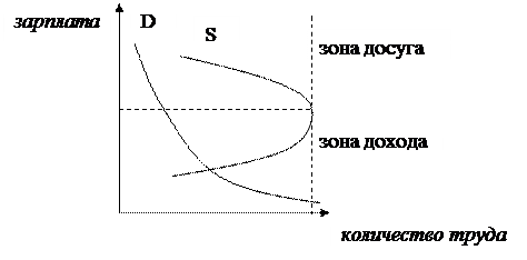 Рынок труда будет стремиться к равновесию, при котором совокупный спрос на каждую категорию рабочей силы будет совпадать с существующим по ним предложением. Особенностью рынков рабочей силы и, в частности, предложения труда выступает то, что работник во многом сам определяет сколько времени он хотел бы работать, а сколько отвести для другого вида занятий и отдыха. Это отражается на графике: