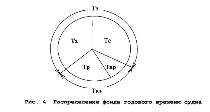 На транспорте продукция создается только во время движения средств перевозки. Стоянки судов, связанные с выполнением грузовых операций, включаются в эксплуатационный период транспортного процесса. Для выполнения работ по восстановлению требуемого уровня технического состояния транспортных средств их выводят из эксплуатации. Годовой фонд времени транспортного процесса судна представлен на рис.4, из которого видно, что он складывается из следующих элементов, судо-сут: Тгф = Тх +Тс +Тр+ Тпр, где Тх, Тс, Тр - соответственно ходовое, стояночное (под грузовыми операциями), и ремонтного время (с выводом транспортного средства из эксплуатации) судна. Тпр - время, включающее прочие выводы судна из эксплуатации (зимовка, отстой, прикол, фумигация и т.д.). Ремонтное время Тр и время прочих выводов судна Тпр составляют внеэксплуатационные периоды Твэ. Для морских судов Тр=0.95Твэ