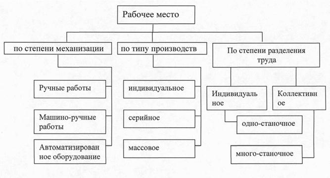 Рис.2.7. Классификация рабочих мест Применение индивидуальной формы организации труда, целесообразно, если за оператором полностью закреплено изготовление изделия или если отсутствует тесная взаимосвязь операции в процессе труда, а также, если средства оснащенности рабочего места позволяют более полно использовать квалификацию каждого исполнителя, например, техническое обслуживание форсунки дизеля. Бригадную форму (коллективную) организации труда целесообразно использовать на таких видах работ, где трудно или невозможно расчленить операцию между отдельными исполнителями и для ее выполнения требуется четкое взаимодействие нескольких рабочих. На судоремонтных предприятиях широко применяется бригадная форма организации труда при ремонте корпусных, малярных, демонтажно-монтажных, трубопроводных, такелажных и др. работ. Такая форма организации труда является наиболее рациональной и экономически эффективной для разделения и кооперации труда рабочих, способствует созданию условий совмещения профессий, а также объединению работающих для совместного выполнения производственных заданий, т.е. созданию бригад. Известно, что виды и число бригад, их производственные связи формируются в зависимости от заданной производственной программы (номенклатуры, объема и сложности работ). Специализированные бригады создаются, когда по условиям производства требуется специализация рабочих мест для выполнения однородных технологических процессов. Такие бригады состоят из рабочих одной профессии, как правило, различной квалификации (например, бригады слесарей судоремонтников по ремонту главных и вспомогательных двигателей внутреннего сгорания, судокорпусников по ремонту конструкций металлического корпуса судов, судовых котельщиков по ремонту паровых котлов, токарей, судовых такелажников и др.) Комплексные бригады создаются для выполнения определенных комплексов технологически разнородных, но взаимосвязанных работ имеющих относительно постоянный объем и требующих участия рабочих различных профессий и квалификаций (например, бригады по доковому ремонту судов в составе слесарей судоремонтников, судокорпусников-ремонтников, электросварщиков, трубопроводчиков, такелажников; бригады по ремонту люковых закрытий и дельных вещей в составе судокорпусников-ремонтников, слесарей судоремонтников, электросварщиков, такелажников и ДР-) Комплексные бригады играют прогрессивную роль в повышении уровня предметной замкнутости внутрицеховых подразделений судоремонтных предприятий. Использование комплексных бригад в судоремонте наиболее целесообразно при создании специализированных участков с замкнутым циклом производства, что позволяет сократить затраты времени на взаимоувязку выполняемых работ, обеспечить непрерывность производственного процесса. Укрупненные комплексные бригады (УКБ) создаются для выполнения значительных объемов работ, чаще из рабочих различных профессий и квалификаций (например, бригады по доковому ремонту судов, ремонту люковых закрытий и др.). При этом необходимо соблюдать следующие условия: бригада должна закрепляться за определенными участками, судами, доками; Основной объем выполняемых работ должен быть сконцентрирован территориально, так как в противном случае затрудняется коопериров