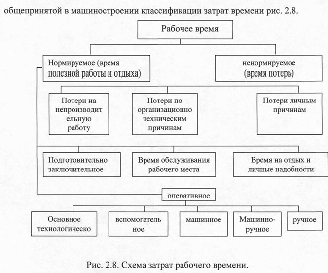 По этой классификации все затраты рабочего времени на протяжении рабочего дня (смены) подразделяются на время работы и на время перерывов. Время работы подразделяется в свою очередь на подготовительно-заключительное, основное (технологическое), вспомогательное и время обслуживания рабочего места. Время перерывов подразделяется на время перерывов, не зависящих от рабочего, и время перерывов, зависящих от рабочего. Подготовительно-заключительное время tnз затрачивается рабочим (или бригадой рабочих) на ознакомление с порученной работой, на подготовку к ней, а также на выполнение действий, связанных с ее окончанием. Это время не зависит от продолжительности самой работы и размера партии деталей, поэтому затрачивается один раз на всю партию, на данную работу или на рабочий день. К подготовительно-заключительному времени относятся затраты времени на получение работы и наряда на работу, ознакомление с работой (чертежом, технологической картой), наладку оборудования на требуемый режим работы, подготовку и установку необходимых приспособлений и инструмента в начале работы и снятие их в конце работы, сдачу работы и документации. Длительность подготовительно-заключительного времени зависит от вида оборудования и характера работы. Основное (технологическое) время to представляет собой время, в течение которого непосредственно происходят количественные и качественные изменения предмета труда; его размеров и формы (станочные, кузнечные, слесарные и другие работы), взаимного расположения частей, образующих изделие или узел (разборочные и сборочные работы), внешнего вида (шлифовка, полировка и др.), структуры и физико-химических свойств металла (термическая обработка) и т. д. Основное время пропорционально объему выполняемой работы (размеру партии деталей), т. е. повторяется с каждой обрабатываемой деталью. Оно может быть машинным, машинно-ручным и ручным. Вспомогательное время tв представляет время, затрачиваемое рабочим на выполнение действий, обеспечивающих осуществление основной работы (например, время установки и снятия обрабатываемой детали, подвода и отвода инструмента, пуска и остановки механизма, промеров изделия, смены электродов и т. д.). Вспомогательное время может быть ручным, машинно-ручным и машинным. В большинстве случаев вспомогательные работы выполняются вручную. Время ручной вспомогательной работы может перекрываться машинным временем. При расчете нормы времени учитывается только вспомогательное время, не перекрывающееся основным (машинным) временем. Вспомогательное время повторяется или с каждой деталью или через некоторое количество деталей в определенной последовательности. Время обслуживания рабочего места to6 охватывает время, затрачиваемое рабочим на уход за рабочим местом (механизмом, инструментом, приспособлением) на протяжении данной конкретной работы и рабочей смены. На станочных, кузнечных и других операциях, выполняемых на оборудовании, требующем подналадки и регулировки в процессе работы, время обслуживания рабочего места подразделяется на время технического и на время организационного обслуживания, рабочего места. Время технического обслуживания рабочего места затрачивается на смену инструмента, на регулировку и подналадку механизма в процессе работы, на правку инструмента и дру