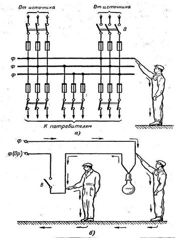 Кроме того, напряжение на отключенной части может появиться из-за электростатических и электромагнитных наводок от влияния расположенных вблизи и находящихся в работе электроустановок и ВЛ, а также в результате случайного соединения токоведущих частей, находящихся под напряжением, с отключенными токоведущими частями (например, прикосновение провисшего или оборванного провода к проводам исправной линии). Вывод: оказывающий помощь не должен без применения надлежащих средств защиты касаться токоведущих частей, даже если ему заведомо известно, что эти части отключены. Запрещается прикасаться без применения средств защиты и к пострадавшему, если тот продолжает находиться в контакте с токоведущей частью. Если пострадавший находится на высоте, то отключение напряжения может вызвать падение пострадавшего с высоты и необходимо принять меры предупреждающие или обеспечивающие безопасность его падения. При отключении установки может одновременно отключиться электрическое освещение, поэтому при отсутствии дневного освещения необходимо наготове иметь другой источник света (например, фонарь), а при наличии аварийного освещения – включить его.