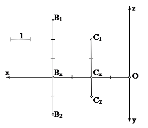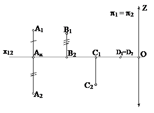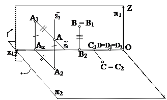 Кеңістіктен кез-келген А нүктесін алып, оның p1 және p2 жазықтықтарына проекцияларын саламыз (сурет 3). Бұл үшін төмендегі шарттарды орындаймыз: 1. (S1А) ^ p1; 2. А1 = (S1А) ∩ p1; А1 – А нүктесінің фронталь проекциясы; 3. (S2А) ^ p2; 4. А2 = (S2А) ∩ p2; А2 – А нүктесінің горизонталь проекциясы. 1.4 суреттегі көрнекі сызба күрделі болғандықтан тәжірибеде сирек қолданылады. Егер осы сызбаны жазық түрге айналдыратын болсақ, онда ол едеуір жеңіл болар еді. Бұл үшін p2 горизонталь жазықтығын x1,2. осінен айналдырып, фронталь жазықтықпен беттестіреміз. сылай алынған проекцияны Монж эпюрі немесе кешенді сызба дейді (сурет 4). Монж эпюрі кеңістіктің графикалық моделі болып табылады. Бұл моделде нүкте нүктеге, түзу түзуге (жалпы жағдайда), фигура фигураға кескінделінеді. Бұл моделдердің қасиеттері кеңістіктегі объектілердің қасиеттеріндей. Кеңістіктің графикалық моделдері сызба геометрия курстарында кеңірек оқытылады. Кеңістіктің координаттық моделі әртүрлі үштік нақты сандардан(координаттардан) тұрады. Әрбір үштік санға бір ғана нүкте сәйкес болады. Кеңістіктегі объектілерді анықтайтын нүктелер жиыны үш айнымалы х, у, z шамалары бар теңдеулермен сипатталады. Координаталар мен теңдеулер кеңістік фигуралар мен нүктелердің өзара байланысын көрсетеді: егер нүктенің координаталары фигураның теңдеуін қанағаттандыратын болса, нүкте берілген жиынға тиісті. Координаттық модельдер аналитикалық геометрияда тереңірек қарастырылады.