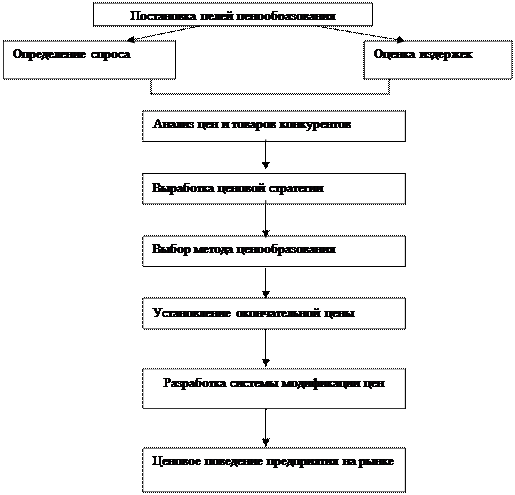 Ценообразование на предприятии представляет собой сложный процесс, состоящий из нескольких взаимосвязанных этапов: - сбора и систематического анализа информации о рынке, - обоснования основных целей ценовой политики предприятия на определенный период времени, - выбора методов ценообразования, - установления конкретного уровня цены и формирования системы скидок и надбавок к цене, - корректировки ценового поведения предприятия в зависимости от складывающейся рыночной конъюнктуры. Ценовая политика — это механизм или модель принятия решений о поведении предприятия на основных типах рынков для достижения поставленных целей хозяйственной деятельности. Предприятие самостоятельно определяет схему разработки ценовой политики исходя из целей и задач развития фирмы, организационной структуры и методов управления, установившихся традиций на предприятии, уровня издержек производства и других внутренних факторов, а также состояния и развития предпринимательской среды, т.е. внешних факторов. При разработке ценовой политики обычно решаются следующие вопросы: - в каких случаях необходимо использовать ценовую политику; - когда необходимо отреагировать с помощью цены на рыночную политику конкурентов; - какими мерами ценовой политики должно сопровождаться введение на рынок нового продукта; - по каким товарам из продаваемого ассортимента необходимо изменить цены; - на каких рынках надо проводить активную ценовую политику, изменить ценовую стратегию; - какими ценовыми мерами можно усилить эффективность сбыта; - как учесть в ценовой политике имеющиеся внутренние и внешние ограничения предпринимательской деятельности и ряд других.