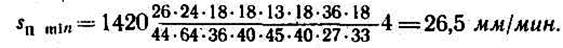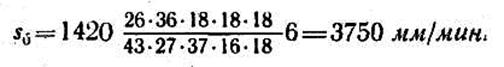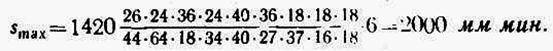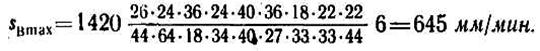 При переміщенні рухомої шестерні 40 вліво кулачкова муфта M1 вимикається, а сама шестерня 40 входить в зачеплення з шестернею 18 двухвінцевого блоку 45- 18, що вільно сидить на валу XII. В цьому випадку широке колесо 40 приводиться в рух шестернями 13-45 і 18-40. Структура коробки подач наведена на графіку мал. 81, 6. Від широкого колеса 40 через запобіжну муфту МП при включеній кулачковій муфті М2, обертання передається валу XIV. Від валу XIV через шестерні 36—27, вал XV, шестерні 18— 33—37, вал XIX, конічну передачу 18—16, вал XX, конічну передачу 18—18, кулачкову муфту M6 і ходовий гвинт XXI здійснюється повздовжня подача столу, найбільша швидкість якої Smax визначається з виразу: