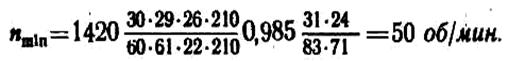 Фланцевий електродвигун потужністю 2,8 КВт (мал. 85, а) пов'язаний з валом / коробки швидкостей пружною муфтою. У коробці швидкостей є потрійний Б1 і подвійний Б2 пересувні блоки шестерень, що забезпечують валу /// шість різних швидкостей обертання, які через шестерні 26—22 натягувального пристрію і клиноремінну передачу 210—210 передаються порожнистому валику V, що знаходиться на шпінделі. Від цього валика обертання передається шпинделю VII через перебір, коли муфта М1 вимкнена, а блок шестерень Б3 введений в зачеплення з шестернями 31 і 71 (як показано на схемі), або обертання передається безпосередньо, коли муфта М1 включена, а шестерні блоку Б3 виведені із зачеплення. Перемикання муфти M1 і блоку Б3 блокуються і здійснюються однією рукояткою. Всього шпінделю повідомляється 12 різних швидкостей (мал. 85,6). Мінімальне число обертів шпинделя nmin з урахуванням пружного ковзання ремінів визначається з виразу: