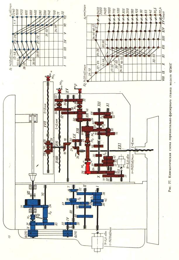 Мал. 85. Кінематична схема горизонтально-фрезерувального верстату 6П80Г. Рухи подач. Привід має окремий електродвигун і складається з двоступінчатого редуктора, шестишвидкісної коробки подач, переборного пристрою коробки реверсів і механізмів повздовжньої, поперечної та вертикальної подач. Обертання від валу фланцевого електродвигуна потужністю 0,6 Квт (мал. 85, а) передається через шестерні редуктора 21—72 і 32—64 валу X коробки подач, а через потрійний пересувний блок шестерень Б4 і подвійний пересувний блок шестерень Б5 - валу XII. Від валу XII обертання може бути передане широкій шестерні 60, встановленої на валу XIII, через шестерні перебору 18-72 і 30-60-60, коли муфта М2 відключена (як показано на схемі), або безпосередньо через шестерні 60—60 при включеній муфті М2. У останньому випадку шестерня 60, встановлена на валу XII, виводиться із зачеплення з шестернею 30 для зчеплення з кулачками шестерні 45. Структура коробки подач показана на мал. 85, в. Широка шестерня 60 встановлена на порожнистому валу і пов'язана з ним запобіжною муфтою МП. Для здійснення робочих подач повинна бути включена кулачкова муфта М3, тоді обертання від широкої шестерні 60 через запобіжну і кулачкову муфти передається валу XIII і через шестерні 34—40 і 48—52 - валу XV, зв'язаному з механізмами реверсів повздовжньої, поперечної і вертикальної подач. Від валу XV через конічну передачу 18—18 і вал XVI приводиться в обертання конічний реверс 28—28—28. При включенні кулачкової муфти М7 в ту або іншу сторону, ходовий гвинт XVII і стіл отримують рух у відповідних напрямках. Максимальна швидкість повздовжньої подачі столу S max визначається з виразу: